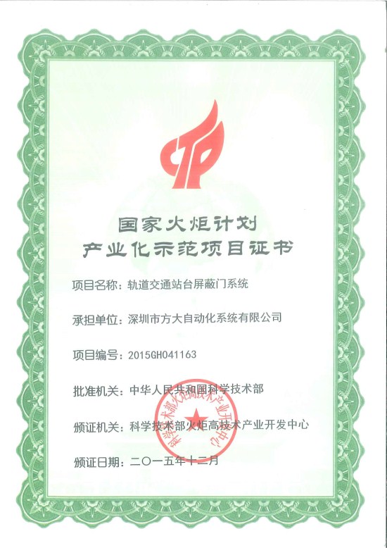 国家火炬计划产业化示范项目是要求属于国家鼓励发展的重点振兴产业和战略性新兴产业领域,是对“转方式、调结构”及地方产业优化升级有带动和示范效应的高新技术项目,有自主知识产权、推动产学研结合的科技成果产业化项目。尊龙凯时集团“轨道交通站台屏蔽门系统”被列入“国家火炬计划产业化示范项目”标志着公司在自主知识产权、科技创新能力方面位列国内企业前列,是国家科学技术部对公司科技创新实力的认可。