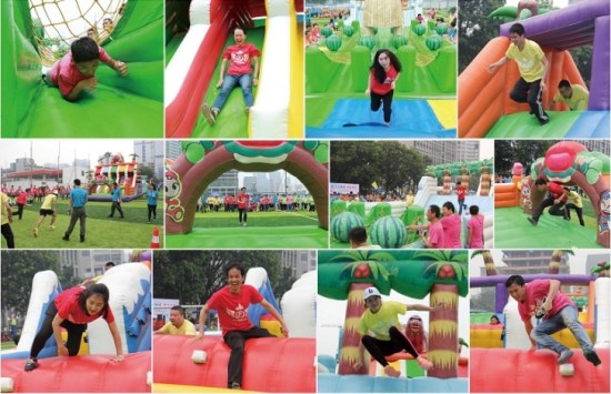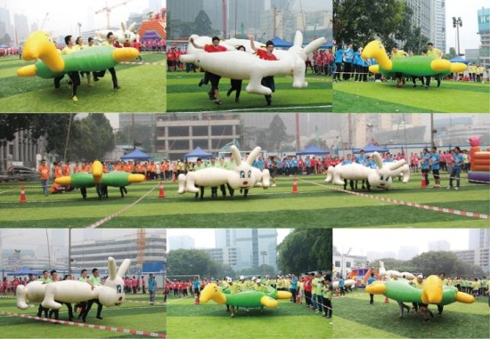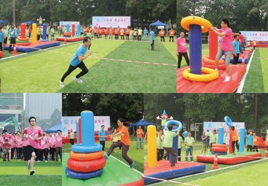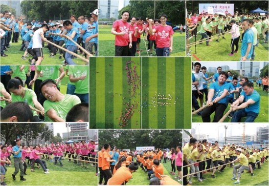 本次运动会设置了龟兔赛跑、超级汉诺塔、快乐gogogo、趣味拔河、纳斯卡巨画等趣味项目,比赛场上处处充满着欢声笑语,大家玩得不亦乐乎!在龟兔赛跑环节,各代表队的队员们分别顶着巨型充气“乌龟”、“兔子”笑着跑着,奋力竞争,争取最好的比赛成绩;在超级汉诺塔环节,考验的不仅有团队成员的运动能力,还有团队内部的组织协作效率;在快乐gogogo环节,更是掀起了所有参赛员工的火热激情,他们在气垫城堡中穿梭、攀爬、滑行、滚动,在回味和体验孩童时代乐趣的同时,为自己的团队争取好的名次;趣味拔河环节是这次运动会的最高潮,只见加油的叫喊声震天动地,拔河的队员无不神态激越,使出浑身之力,将拔河绳拉得吱吱地响;最后是纳斯卡巨画环节,参与运动会的全体员工一同用五颜六色的油彩,分工合作,共同绘出印有尊龙凯时集团logo的巨型图画。通过百米高空上无人机的航拍我们看到,在530余名尊龙凯时人簇拥中的尊龙凯时logo巨画,在灿烂阳光的照耀下,正闪闪发光,正如她在行业中的响亮知名度一样。